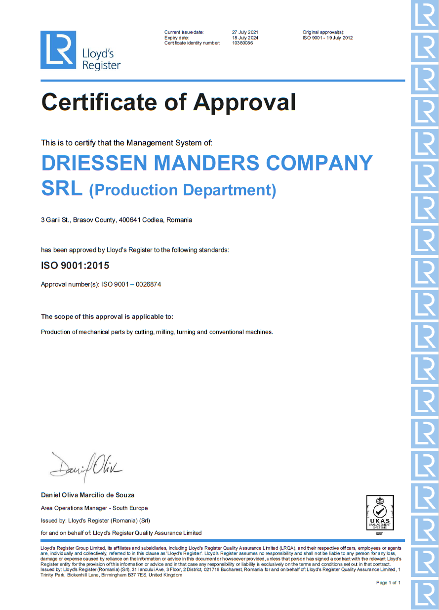 We have implemented an efficient quality management system (QMS), based on ISO 9001:2015 standard. We obtained the ISO 9001:2008 certificate in July, 2012 and since then, the QMS is maintained. After the recertification audit from July, 2021, the ISO 9001:2015 certificate is valid until July 2024. We are certified by Lloyd's Register.